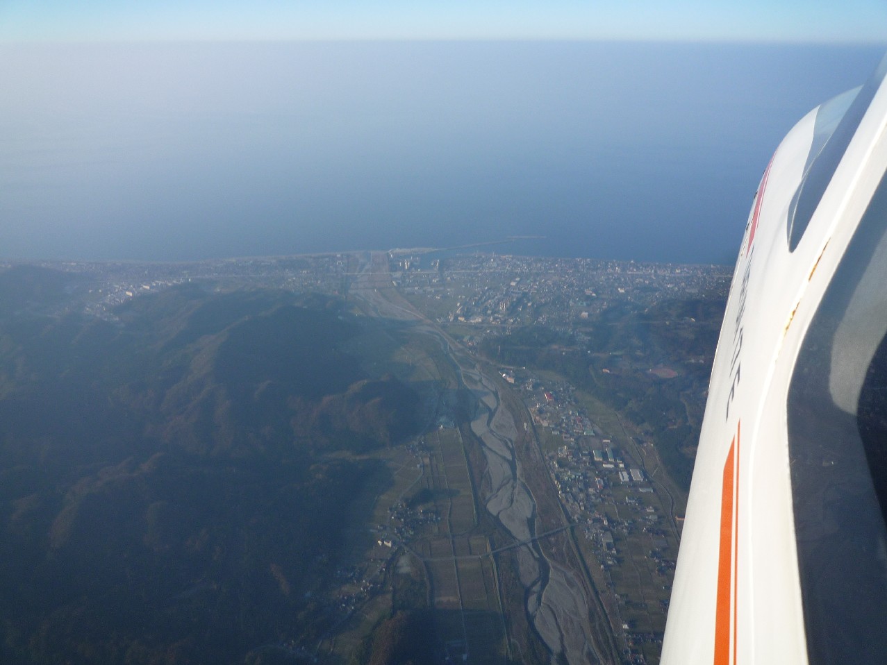 15:15糸魚川(写真)に所要時間0+55で到着、往路187kmは弱い向い風の中を平均速度204km/hで飛行して来た。この季節には穏やかすぎる日本海の洋上で右に上昇旋回7500ftまで高度を上げ追い風を受けて帰路を急いだ。