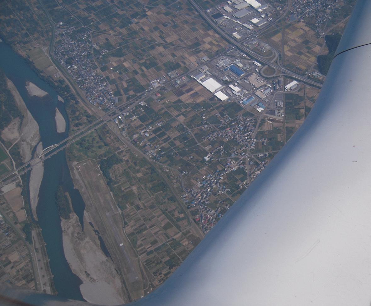 同様に許可を得て7000ftで直上を通過した長野滑空場は、写真右上の上信越自動車道-須坂長野東ICから車で5分ほどの距離で、長野市の中心市街地から東方のエムウェーブが目印、千曲川に掛かるアーチ橋(屋島橋)の東岸河川敷に長さ850m(南側450mが舗装) R/W04/22が確認できる。