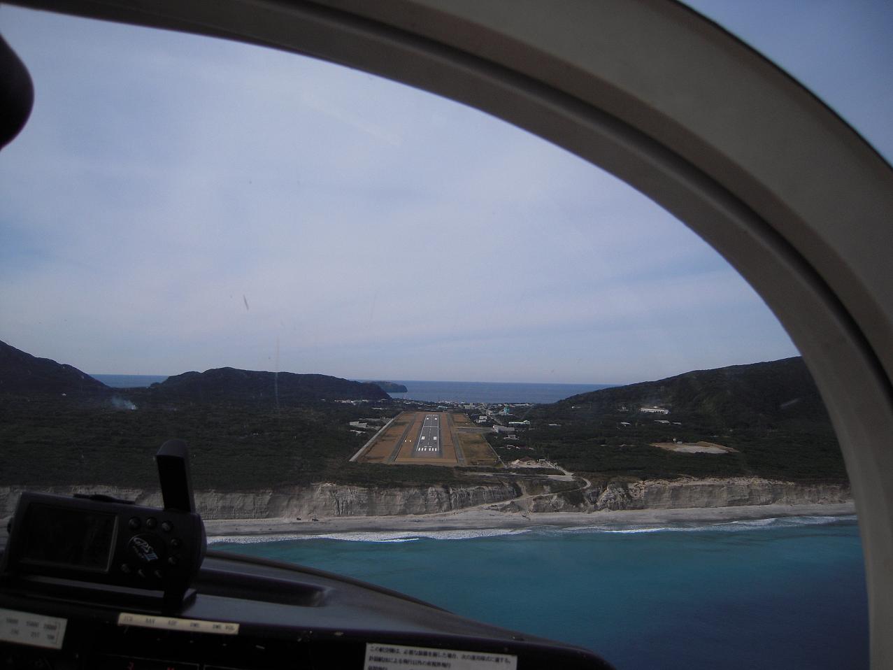 写真は、新島空港R/W29のライトパターンからファイナルターンした所で、滑走路の手前の高さが30mある崖の下が、ウミガメが産卵に来る白砂の羽状浦海岸でサーファー達の聖地になっている。