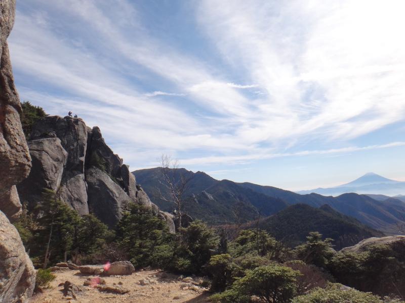 8月は長雨で、秋山のベストシーズン10月は停滞前線と台風21号と22号が2周連続で襲来して各地で記録的な雨量を観測した。このため8月のクラブ山行が流れ、10月の自治会ハイキング(28名応募)も台風の大雨が流してくれた。例年なら8月から10月は毎週ほぼ連続で歩き、今頃は体力レベルが最高潮に仕上がるのだが、今年は体が鈍ったまま。今日は終日穏やかな晴天が約束されていたのだから、3時に起きれば今年の運行が5日で最後になるバスで6時過ぎには広河原に立てたのに、5時半起床がやっと。体だけではなく根性も鈍っていた。日が短い季節なので朝のスタート遅れは厳禁。金峰か瑞牆に登る予定で瑞牆山荘から歩きだすが、前回の山から3週間以上過ぎて体が重い。分岐点の富士見平小屋で躊躇なく金峰山を右に見送り、左の瑞牆山へ向かった。水量を増した天鳥川を渡り直登に入ると、長く続いた雨の影響か、大ヤスリ岩の基部近くまで沢水が流れる様は珍しい。平日でも瑞牆山の人気は凄く、20人以上で賑わう山頂を離れ「奥座敷のテラス」で小春日和の一人静かな時間を過ごした。「奥座敷のテラス」からの展望(写真)富士山、金峰山、左上に登山者が見える瑞牆山を見上げる。平坦な部分がほとんど無い山頂に比べ、このテラスには8畳と3畳ほどのフラットなスペースが有り、北側に屏風の岩壁を背負い寒い日には冷たい風を避けてくれる。瑞牆山荘08:05~瑞 牆 山10:15 2+10