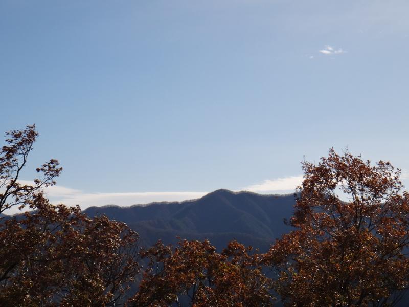 コースも終盤に差しかかり破風口の狭く小さなコルから大室山への最後の登りが、今日一番の急勾配になるが、特に急峻な場所には段差を小さく、踏みしろを広く作った木製の階段が設置され、遊歩道レベルの整備は過剰に思う。しかし道が良いと景色を眺める余裕があり、標高が上がると振り返る絶景が遠くまで見渡せる(写真)。中央には夏のクラブ山行で登った御正体山が大きく、その延長線に遥か南アルプス南部の雪の稜線が白く光る。今日は初めて訪ねる道志村へ大室山と鳥ノ胸山の計画で6時に自宅を出発し、双葉ETC~都留ICまで高速を飛ばす。7時半に登山口の駐車場に着く。県外車が2台、平日でも先行者が居るようで安堵する。山頂までのコースタイムは3時間、頑張って昼までに下りて午後は鳥ノ胸山の予定だ。単調な道をペースを上げて登り、白石峠から加入道山への尾根に着くと道の様子が一変する。丸木の階段が随所に現れ、非難小屋も木の香りが心地よい立派な造りで驚く。地図に目を凝らすと登山道は僅かに県境の東を通っている。県境を境に県の財政格差が山にも。次回は神奈川県側から登ってみよう。道志の湯07:40~大室山10:35 2+55