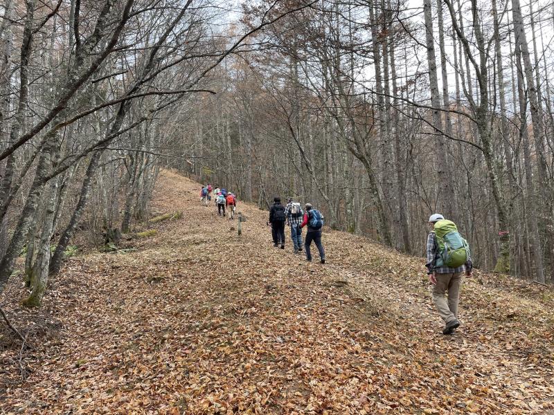 山の会の読図トレーニングに参加させて頂いた。基礎的なコンパスの使い方を学んだ水曜日の座学に続き、今日は実地トレーニングが開催された。寒冷前線の通過で午後から降雨の予報だったが、ベテラン講師陣を含め総勢14名が焼山峠に集結した。先ずは駐車場でコンパス1・2・3を練習する。この後は4グループに分かれミニオリエンテーリング(自身42年ぶり)でA~B~Cのポイントを1+30で周回した。焼山峠に戻り、男女別に2グループに分かれて小楢山までの実践トレーニングに臨む。基本はPDCAサイクル。登山道上に講師が設定した6ケ所のポイントを地形図とコンパスを使って確認しながら登る。①地図から地形の特徴をつかむ。②等高線と距離から地点間の所要時間を算出する。③周囲の地形から常に現在地を把握する。今までの登山でこれほど真剣に地図を見たことは無かった。登山の新たな楽しさを発見する。雨は下山後のミーティング中に落ちてきた。 TX焼山峠11:00~小楢山12:20 1+20