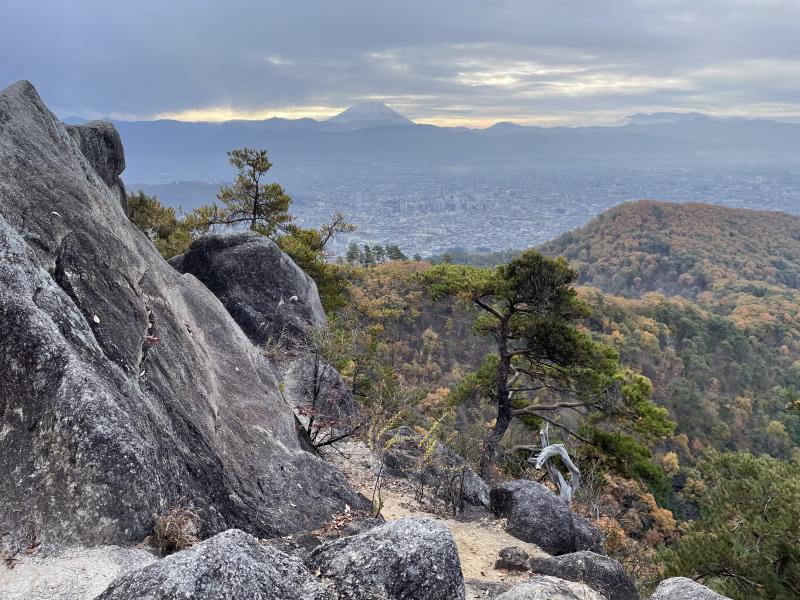 雨予報の日曜日、特に午後から降水確率が高い。トレーニングを降り出す前、午前中の早い時間に組んだ。ラジオ体操を終え緑ヶ丘へ向かうと小雨が落ちてきた。折畳み傘を持ってスタートする。紅葉も一段と色を増し、山道は大量の落ち葉で埋もれている。序盤は抑え気味に湯村山15分、法泉寺山を30分で通過する。この後の急な下りを落葉で足を滑らせながら下る。体が完全に温まって額に汗が滲んだらペースを上げるつもりだが、気温が低く汗が出ない。ようやく第二東屋(新しい温度計が付いた)を過ぎて汗が落ちた。この汗を合図にギアチェンジ、花崗岩の急坂を軽快に上がり八王子山を57分で通過する。この後は難所の急降下(白イワカガミ群生地)を慎重に下る。最後は走ってゴールしたが平凡なタイムに終わった。それでも富士山と鳳凰三山の眺望に癒された。 FT緑ヶ丘07:05~白 山08:05 1+00(8℃ 62.00.23)