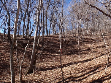 コースはいきなり急登で始まり、薄い踏み跡に積もった落ち葉(写真)で不明瞭な所が続き赤テープを頼りに進む。(林道に出て牛奥の登山口からはコース明瞭)