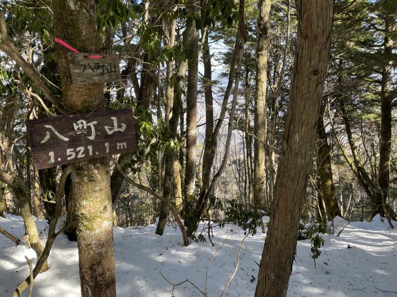 今年から甲斐百山を最低一座が毎月のノルマになっている。それが今月は自治会に縛られ、登れないまま月末が迫った。こんな時は誰かと約束する事で、無理しても登るしかない。クラブのY君を誘い鰍沢の八町山(1521m)標高差590m、健脚度☆困難度★★を目指す。昨夜は21時半まで会議、それから総会の資料作りで睡眠時間は3時間だけ。鰍沢警察署から約10kmの林道走行で登山口の八雲池キャンプ場に着く。先行者は県内ナンバー1台だけで周辺に人の気配は無い。登山口を示す指導標の類もない。頼みのガイドブックを読み林道足馴峠線の起点標柱からスタートする。10日に県内全域で警報級の降雪が有ったから直ぐに雪道になる。林道の分岐点からコンクリートの階段を上って直ぐを左折が登山口だが、この分岐を見落とし直進方向に延びる明瞭なトレースとピンクテープに誘い込まれ、沢の突当たりでトレースもテープも消えた。分岐を探しながら戻り1時間のロスタイム。気を取り直して再スタートだ。傾斜は緩いが本の情報通り倒木など荒れた道が続く。この登り中間点付近で先行者の2人組が下りてくる。この日に出会った唯一の登山者だった。山頂まで僅かな距離の出頂ノ茶屋跡に着き油断からか再びロスト、林道に出くわす。山で初めて使うスマホのGPSで山頂の方位を定め、雪の急斜面をキックステップで強引に直登する。CTの3倍近くも掛けて何とか頂上は踏めたが反省しきり、後味の悪い32座目になった。 SC八雲池08:55~八町山13:10 4+15