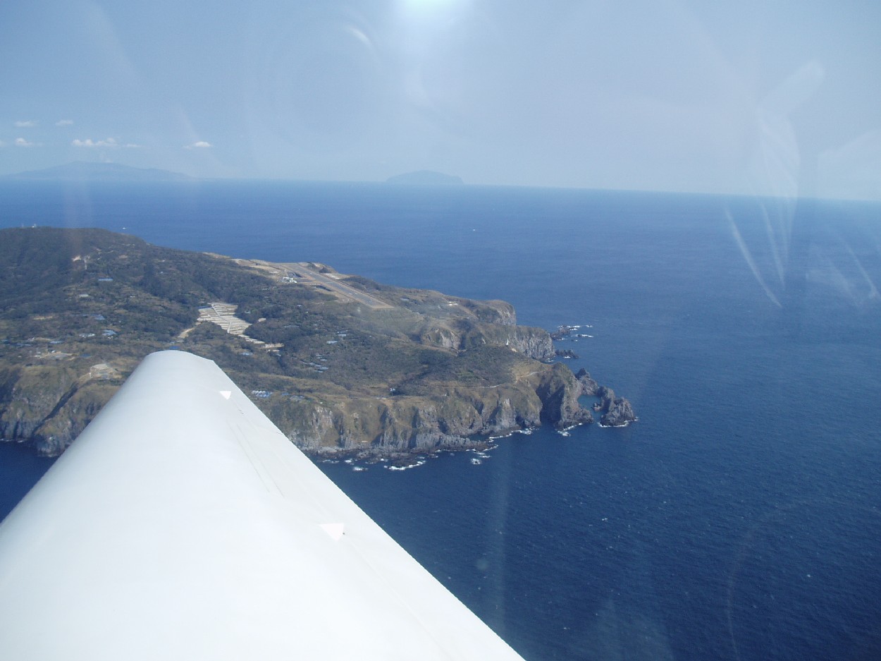 写真は、神津島空港から西向きに離陸した後、右に旋回して振り返る。