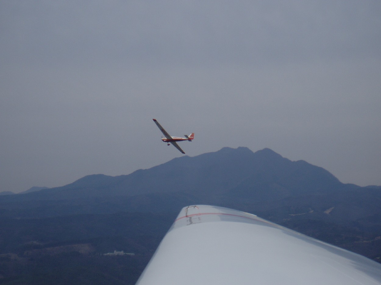 写真は、双葉へ着陸態勢に入る直前にフォーメーションを組んだ練習機ファルケ(後席Y君撮影)が右旋回でブレイクして行く。
