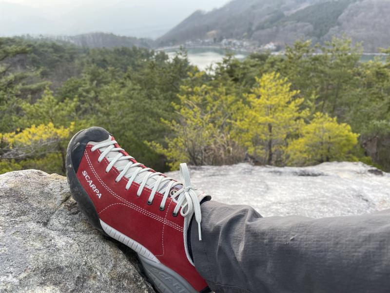 アウトレット50%OFFの赤いアプローチシューズが届いたので、早めに仕事を切り上げ緑ヶ丘に向かう。スポーツ少年団の野球やサッカーで賑わうグランドを横目にスタートする。3月とは思えない季節先取りの陽気、上着も手袋も要らない。手には500のペットボトルを持ち、歩を止めずに給水する作戦だ。湯村山12分、早くも汗が流れマスクを外す。法泉寺山24分、調子は良さそうだ。上着を脱ぐロスタイムもない。コル28分、ベスト更新を意識する。後半の登りは左の山腹にコースをとり、花崗岩の道に変わる所で給水する。人気のハイクコースも平日のこの時間は空いていて、ここまで出会ったのは4人だけ。すれ違いに気を使うことなく八王子山を43分で通過する。ラスト区間は5分、ベストに36秒及ばなかったが2回目の48分台を記録した。空は春霞で眺望はなかったが、イタリアンレッドの靴がテンションを上げてくれた。緑ヶ丘15:00~白 山15:48 0+48(16℃ 48.51.83)