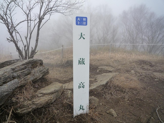 写真は、視界100m絵にならない霧雨の大蔵高丸(1781m)山頂の標柱。
