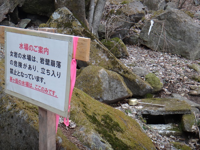 毎年4月の第一日曜は自治会の総会が開催され昼の少し前に公民館を一番に飛び出した。曇り空には薄日がさしているが北方10kmの茅ヶ岳は半分から上が雲の中、昼食もそこそこに急いで支度を整え13時には深田公園から歩き始めた。今年初めての山歩き、昨年最後も茅ヶ岳だったな。里は桜が満開なのに僅かでも芽吹きを期待していたが色のない道。今日で茅ヶ岳に登るの何回目かな。40年以上前にC山岳部の仲間と登った記憶がよみがえる。色んな事をぼんやりと考えながら歩くのが好きだ。やがて道は林道を横断し女岩コースと防火帯尾根コースに別れるが真っ直ぐに進む。しばらくして熊鈴の音が下って来るが、案の定コースは左の防火帯尾根で音だけ遠ざかっていった。4ヶ月のブランクで落ちた筋力を取り戻すようにペースを少し上げて大粒の汗が流れ出す頃に、女岩の下部に着く。女岩は周囲を見事なブナ林に囲まれたこの山域で唯一の水場で一年中枯れる事なく岩清水が湧き、特に夏場の暑い季節にはマイナスイオンに包まれる茅ヶ岳のオアシスとして登山者から愛されて来た。だが、残念なことに近年は基部周辺で大規模な崩落が発生して危険な為、50m手前で立ち入り規制のテープが張られてしまった。今日も休むことなく頑張ったが、女岩を右手から高巻く頃に雨が降り出し撤退を判断した。写真は、女岩から100mほどの水場で昔から有った物を整備して利用しやすくなっている。深田公園13:00~女岩の上部~饅頭峠~深田公園15:00 2+00