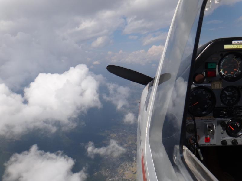 厳しいエマージェンシー訓練から習得した危機対応は「最悪に備え最善を期す」だった。だから不時着場を探しながら長野滑空場へのダイバートを決断し、千曲川を20マイルも下って来たのだが、その道も閉ざされ最悪の事態が現実味を帯びてくる。この絶望的な窮地に於いても、「客観的に事態を捉え冷静に対処せよ」と教本には書いてあるが、立ち止まって考えることが出来ない空中で、機体を操っているのは感情を持った人間である。焦り、恐怖、責任、、、色んな物が去来して情緒が乱れ、それが機体の挙動となって現れる。もはや自身の力量では如何ともし難い領域に踏み込んだのか極度の緊張に記憶も途切れた。後に解析したGPSのデータには、袋小路の千曲川上空でもがく必死の旋回が記録されていた。我に返ったのは美ヶ原から北に連なる稜線の鞍部に小さな青空を見つけた時だった。雷雲が移動して松本盆地への脱出口が開いたのだ。この峠を越えれば松本空港があり燃料の補給もできる。残燃料を信じてフルパワーで上昇態勢に入るが再び・・・。雷雲の終息期に発生する下降気流と、雨に弱い高速性能重視の翼形で本来の上昇率が得られない。山肌が容赦なく迫り木々の輪郭まで見えた時、S教官の「フラップ1段」を思い出した・・・continue画像は、エンジンを停止して積雲の合間を滑空するJA2369の小窓から。S教官との別れ Ⅱ2016-04-19