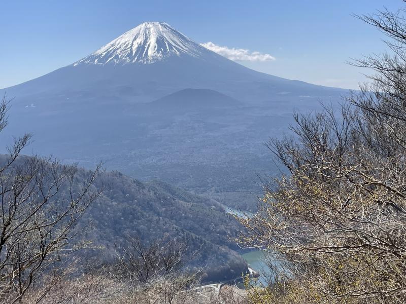 月1座を目標に掲げて始めた甲斐百山だったが、思うように登れていない。昨日の強風も収まり、快晴が約束された今日は富士山の展望をお目当てに烏帽子岳を登った。計画は本栖隧道の駐車スペースからスタートして烏帽子岳へ、ついでにパノラマ台を経て三方分山までピストンする。良く整備された道を一登りで烏帽子岳、単独男性が休憩している。この後パノラマ台の先を左折して中之倉峠から本栖湖に下りると聞く。ここから20分弱でパノラマ台、その名の通りの大パノラマに見とれて20分も休憩してしまう。目指す三方分山は直線距離2500mと直ぐ近くに見えるが、実際に歩いてみるとアップダウンが連続して地味にきつい。それでも眺望は素晴らしく西に連なる南アルプスの白い稜線が目を楽しませてくれる。風は無いが気温は低く霜柱を踏んで軽快に歩を進める。この区間で単独男性と男女のペア2組とすれ違う。晴天の日曜日も早い時間は静かだ。やがて誰も居ない三方分山(1422m)に着く。10年前には無かった甲府名山の標柱が立っている。南方が開けていて真下に精進湖(写真)が見える。 TX本栖隧道07:10~三方分山09:30 2+20