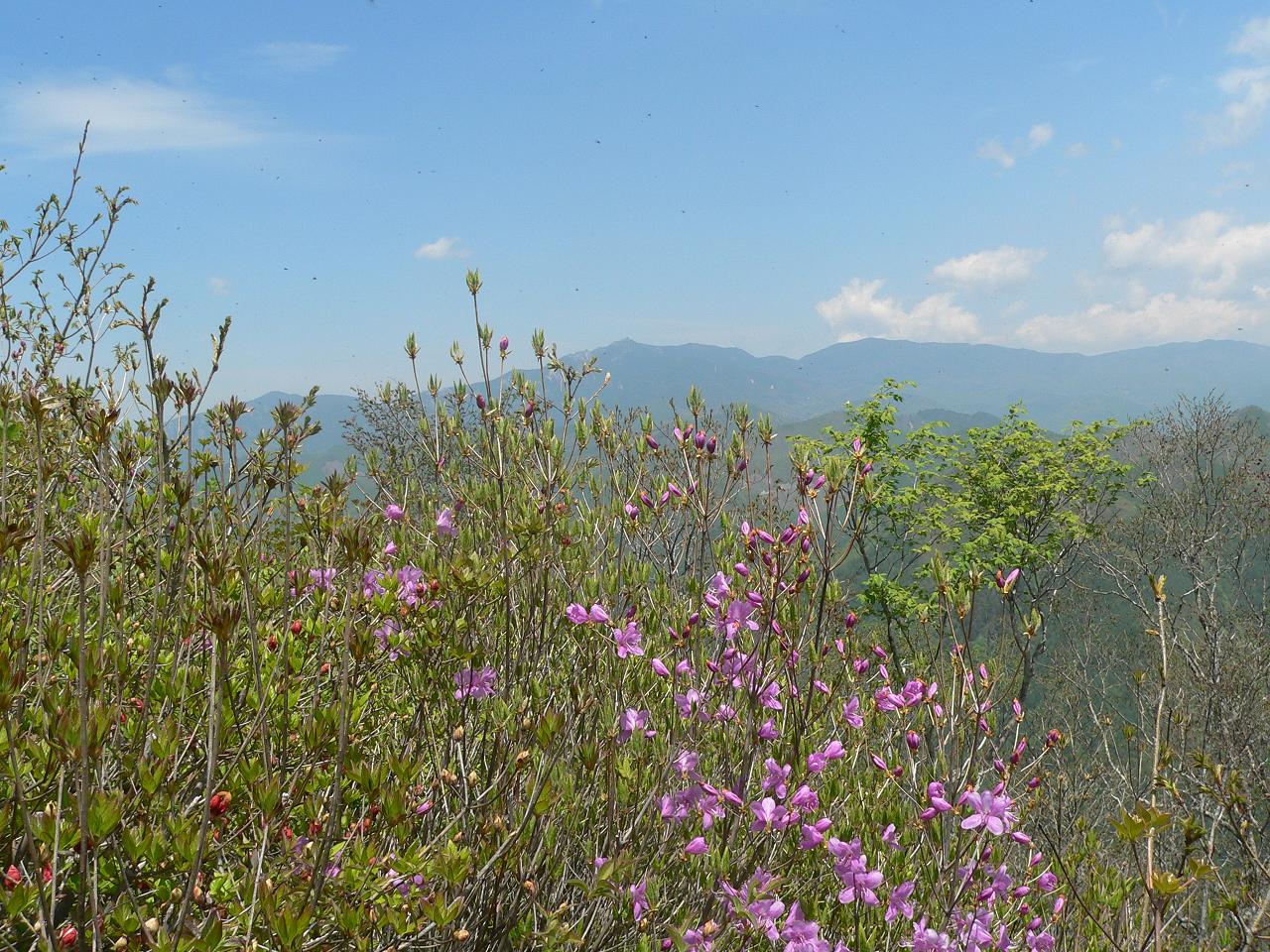 だがそれも緩やかな前半まで、女岩の水場を過ぎ険しい急登になると息が上がり足場の悪さも有って目線は足元ばかりに落ちてしまう。時々立ち止まりブナの若葉に目線を上げて新緑のエネルギーを貰おうと励ます。でも、たとえどんなにゆっくりでも歩いていれば必ず着くのが頂上で、やがて前方が空だけになり快晴の茅ヶ岳(1704m)に立った。写真は、咲き始めた山頂のミツバツツジの向こうに金峰山を見る。眺望は今日も360度で、空には珍しい彩雲(水平環)まで現れ我々の登頂を祝福してくれた。