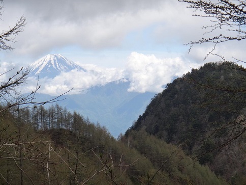大峠山を下る頃になって雲が切れ始め、登ってきた兜のような形をした源氏山の左に富士山(写真)が見えた。
