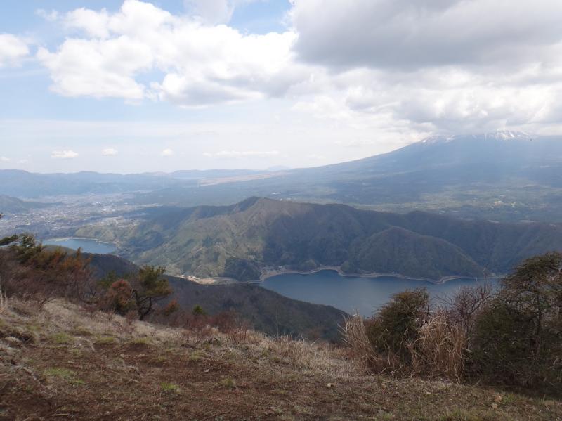 山歩きに興味を持ち始めたが何も分からない、店の常連さんM君24歳をガイドして初めての登山を体験してもらった。今までに山菜取りの経験はあるが登山として山を歩くのは全く始めてだと言う。当初は笠取山を計画していたが、晴天のGWとあって相当の混雑が予想され、山の大きな魅力である喧騒から隔絶された静けさは期待できない。どこに登るか選択の条件は、人が少なく、抜群の眺望、危険レベルは低く、体力レベルは多少きつくても達成感は重視したい。あまり悩むことなく決まったのは御坂山塊の鬼ヶ岳(1738m)で、雪頭ヶ岳と双耳峰を成し、すぐ東の十二ヶ岳からは凄い迫力の鬼の顔に見える。コースは西湖畔の根場いやしの里(900m)を基点に雪頭ヶ岳~鬼ヶ岳に登り、大展望を楽しんだ後は主脈縦走路を西へ、鍵掛峠から根場に戻る標準タイム4時間50分の周遊コース。久し振りに若い人(40歳の差)と登る気分は良い。スタートからの快調なペースは急坂になっても落ちない。登山口の駐車場が遥か下に見える。眩しい若葉の道、先行する3グループ9名を追い越して、予定より30分以上早く穏やかな雪頭ヶ岳のピークに到着した。少し早いがランチにしようか。富士五湖は山中湖から精進湖まで四湖を見下ろす絶景(写真)を眺めながらの昼飯は最高だ。更に次のピーク鬼ヶ岳には南アルプス、八ヶ岳、秩父連山と甲府盆地の街並みを一望する360度の大展望が待っていた。根場の里09:10~雪頭ヶ岳11:20 2+10