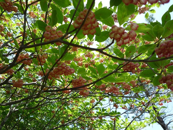 この辺りからレンゲツツジの朱色が際立ち、満開のドウダンツツジ(写真)や日陰に咲き遅れたアズマシャクナゲが淡いピンク色を見せてくれた。