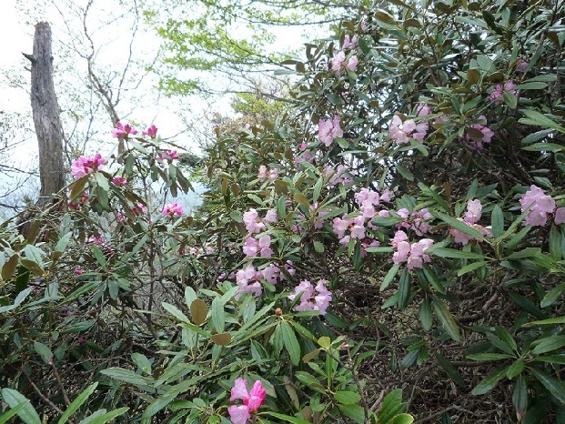笠取山の頂稜は東西に3つのコブからなり、中央のピークが最高点(1953m)で東のピークとの間に見事なアズマシャクナゲの群生地(写真)がある。