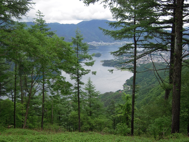 新緑が眩しい緩やかな道は左に西湖を見下ろしながらの登りで北岸の十二ヶ岳(1683m)の稜線は雲に覆われ、その荒々しいピークは望めない。