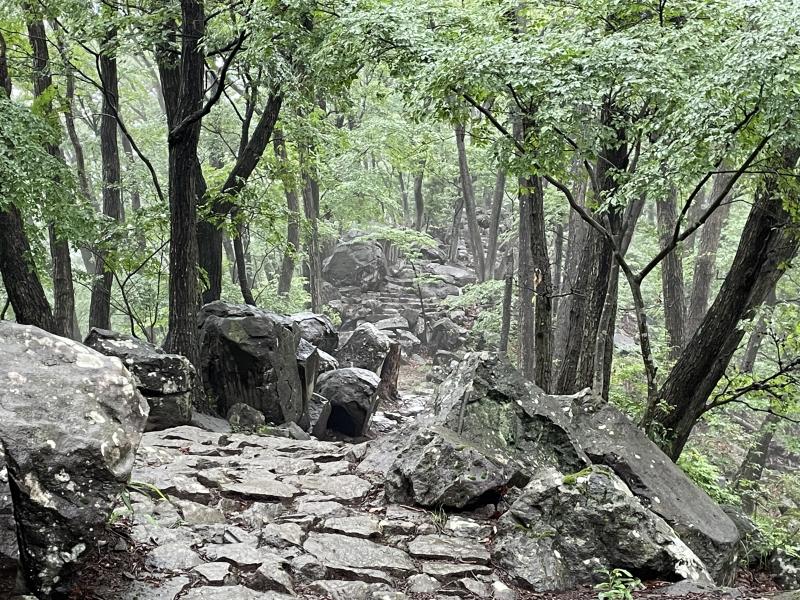 台風3号に刺激されて前線が活発になり8日(木)に関東甲信も梅雨入りが発表された。明け方から降り始めた雨は昼に掛けて本降りになり週一のトレーニングは諦めていた。それが昼過ぎに小雨になり希望的に空が明るく見えた。この時期は雨を理由にトレーニングの間隔が開き、苦労して取り戻した体力が失われる。雨は止む気配はないが意を決して緑ヶ丘に向かう。閑散とした駐車場で支度を整え、傘をさしてスタートする。湯村山へは水はけの悪い粘土質の路面で、滑りやすくストライドが伸びない。湯村山12分31秒、直後の下りを走ると派手に滑って転びそうになる。傘に当たる雨の音も大きくなり、この時点で今日のゴールを法泉寺山と決める。法泉寺山への登りは戦国時代の石畳の道(写真)を行く。道幅いっぱいの大きな水溜まりも、乾いていればスピードが出せる石の階段も慎重な歩きが求められる。25分も掛かり法泉寺山に着いた。雨は断続的に降り続く。今日はハーフの練習で少々物足りなかったが、一週間以上空けずにトレーニングする事に意義があった。 SM緑 ヶ 丘13:50~法泉寺山14:15 0+25(25.53.76)