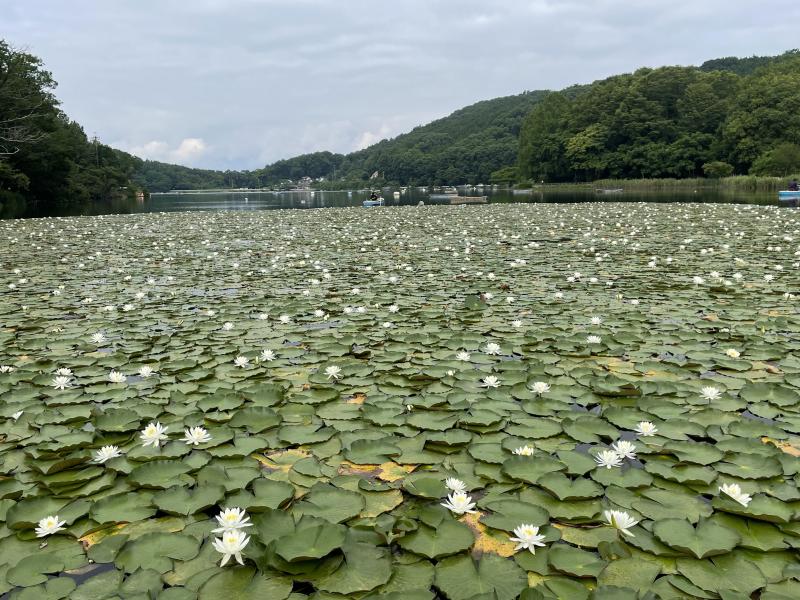 正午から急逝したクラブメンバーの葬儀があり、計画していた八ヶ岳は中止にした。何度も登山を共にした仲間の、余りにも突然の訃報にショックは大きい。日課のラジオ体操を終え、緑ヶ丘に向かう。沈む気持ちを奮い立たせてスタートする。湯村山12分、ヘッドバンドを巻く。熱中症を警戒してか、早朝の割に人が多く何組も先行者を追い越す。法泉寺山を何とか24分で通過する。この後の急な下りでトレランの青年が登って来て譲り合う。コル通過は28分と記録更新は厳しい。後半戦の登り始めも先行グループが巻き道を行くので、尾根通しを選択する。第2東屋38分、調子が上がらない。八王子山への登りでは山の会のメンバーが下って来て挨拶を交わす。八王子山43分、暑くて汗が流れる。いつもは全力で走るラスト区間は歩いて、白山は49分でゴールした。今日はスイレンの花が見たくて、少し休んで千代田湖へ下る。湖畔の北東にスイレンの群生地(写真)がある。スイレンの畔で亡くなった友を偲ぶと30分も経過してしまう。帰路は白山への登り返しで始まる。生かされている命、限りある時間、毎日を大切に生きよう。あらためて心に誓う。 SM緑 ヶ 丘07:00~白 山07:49 0+49(20℃ 49.19.18)