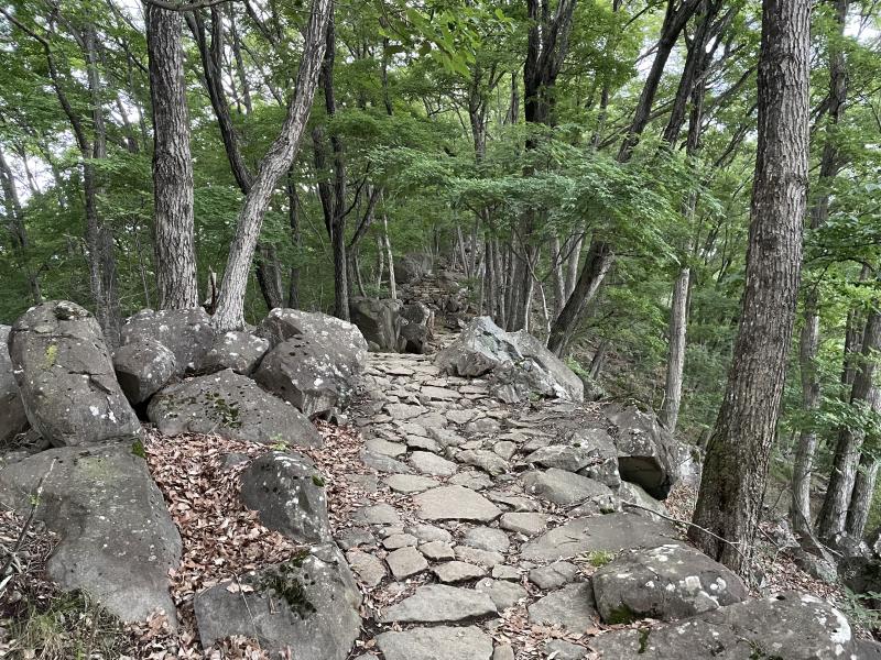 雨音で目覚めた日曜日は昼から仕事が入って週一の白山トレーニングは断念かと思われた。だが今週は木曜日のクライミングも休んだので、5時で仕事を切り上げて緑ヶ丘に向かう。少年サッカーで賑わうグランドを横目に、アミノバイタルを飲んでスタートする。間もなく夏至でも森の中に入ると暗さが際立つ。ライトも持っていないので法泉寺山までと決める。湯村山12分25秒、朝に掛け相当な降雨があったようで下りは滑る。やはり雨上がりだった2週間前にヤマビルに噛まれたことを思い出す。噛まれると厄介なので出来るだけ道の真ん中を進む。薄暗くなると鹿の甲高い鳴き声が響く。鹿が増えたことでヤマビルの生息域も広がっているようだ。やがて法泉寺山への登りになると山城を偲ばせる石畳の道(写真)になる。石を積んだ階段を乳酸と戦い駆け上がれば法泉寺山の頂上に着く。少し休んでいたらパラパラと雨も落ちてきた。僅かな時間だったが運動できて良かった。SM緑 ヶ 丘17:30~法泉寺山17:55 0+25(25.18.61)