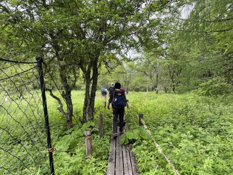 山の会主催2024公開登山教室の第4回が櫛形山で開催されスタッフとして参加した。総勢42名が4班に別れて、北尾根を登り、中尾根を下る周回コースで櫛形山ハイキングを満喫した。天気は下り坂で昼前から小雨の予報に、出発前のミーティングを省いて予定より早目の登山開始になる。櫛形山には何と448回目になるリーダーAさん率いる2班でトップを託され、全体でも先頭でスタートする。2班の受講生6名は皆さん次回の北岳を目指していて、少々ペースを上げても平気な様子で頼もしい。CTの83%100分でアヤメ平に到着して木道を散策(写真)する。裸山の眺望は生憎だったが、満開のアヤメには歓声が上がる。櫛形山へは薄い霧が立ち込めて幻想的な原生林コースを取る。山頂ではゆっくりと昼食タイムを過ごし、希望者は奥仙重の三角点をピストンした。ほこら小屋に着く頃に小雨になる。リーダーから下山は慎重にと注意喚起があり全員無事に帰途に着いた。TXみはらし台07:00~櫛形山10:40 3+40