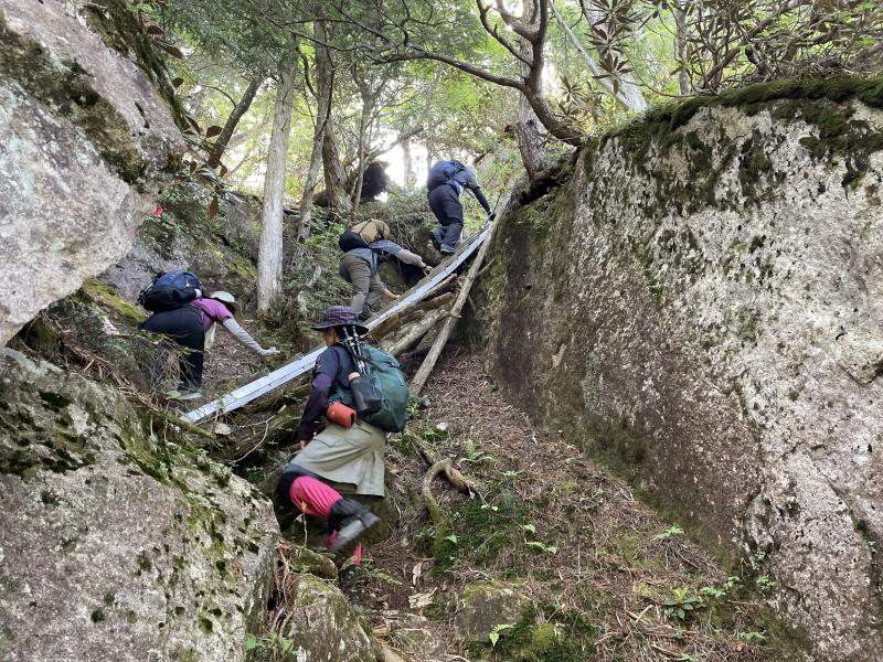 5月が延期になった金峰山の表参道に総勢11名が参加して、山の会で初CLを務める日がきた。天気は概ね快晴、暑さ対策で多めの水を持参して貰う。5時集合梅の里~6時に登山口駐車場に着く。夏至とは言え長丁場のピストンなので速やかにスタートする。造林記念碑60分、1回目の休憩る。メンバー全員の体調に問題はない。水晶峠120分、順調なぺースだ。もっとも参加者のレベルからして当然だ。小屋跡を過ぎると本格的な修験者の道に変わる。スラブ壁165分、乾いて問題なく通過する。急峻な登りはキツイが皆で頑張る。3時にスタートした言う2人組が下りて来て挨拶を交わす。方手廻岩195分、直下のハシゴを登る(写真)。山頂直下のゴーロで4時半スタートの2人組が下りてくる。出会ったのは4人だけだが、直下の岩陰には満開のイワカガミが迎えてくれた。全員元気に往路、復路ともに計画通り踏破できた。SLのAさん始め、参加メンバー全員に感謝したい。TX駐車場06:15~金峰山11:30 5+15