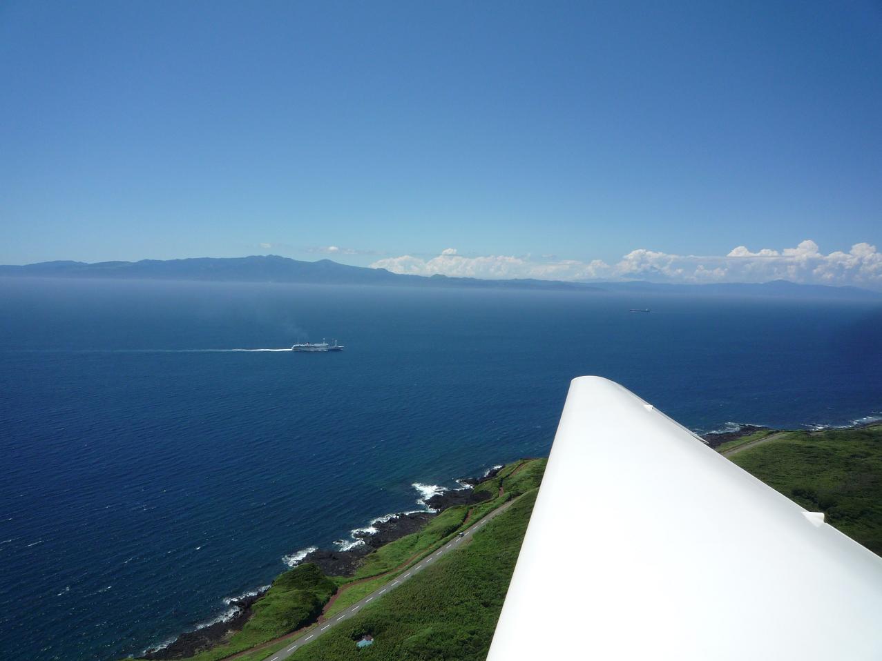 写真は大島空港R/W21を離陸後に右に旋回、船の向うに見えるのが伊豆半島で翼端の先に見える富士山には積雲のヴェールが掛かり始め、その右方の箱根から北の内陸部では積乱雲が発達し始めている。