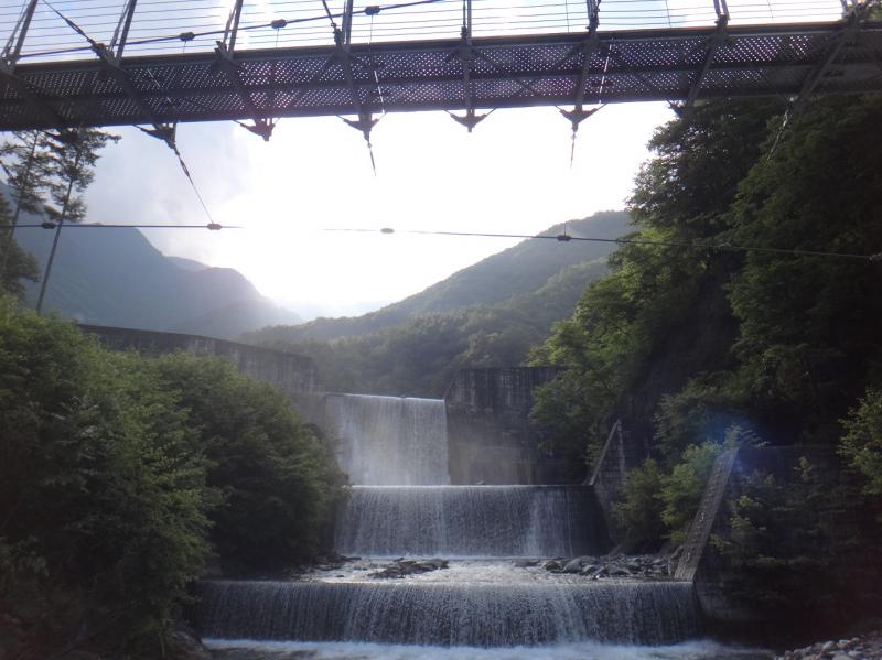 停滞前線で日曜日も曇り時々雨の相変わらずの予報だったから、昨夜は同級生と久し振りの飲み会で羽目を外して飲んだ。朝日の眩しさに目覚めると青空が見える。天気図は太平洋高気圧が張り出した梅雨明けの気圧配置になっている。天気予報に騙された。慌てて飛び起きるが二日酔いで登山以前に酒気帯び運転になる。今年はコロナで広河原バスが運休になり、北岳から間ノ岳は登山禁止に、また域内の山小屋が全休業になり、計画していた白峰三山縦走が絶たれた。ならばと農鳥岳(3026m)の日帰りを計画した。奈良田から山頂の標高差約2200mを往復12時間(標準の77%)で歩く。当然スタートは夜明け前にヘッドランプで歩き、下山もラスト区間は日没後も覚悟する。なので駐車場から登山口に至る55分と、崩落による迂回路の部分、さらに最初の吊り橋まで辺りが真っ暗闇のランプ頼りを想定している。下見の必要がある。アルコールが抜けた14:20に自宅を出発する。双葉ETCから早川ICに14:50(630円)高速が早川まで延伸したから早い。しかし県道は工事中の片側交互通行が多く奈良田には15:30着となる。公営の無料駐車場は三角コーンで閉鎖されている。適当に路肩駐車で直ぐ出発する。トンネル前左折に登山ポストが。直ぐのゲートには登山自粛を促す張り紙があり駐車場閉鎖の意味が分かった。登山口は右手の東屋を過ぎて少し下った所にあった。迂回路の崩落地点も確認、最初の吊り橋(写真)で引き返した。奈良田15:40~吊り橋16:20 0+40