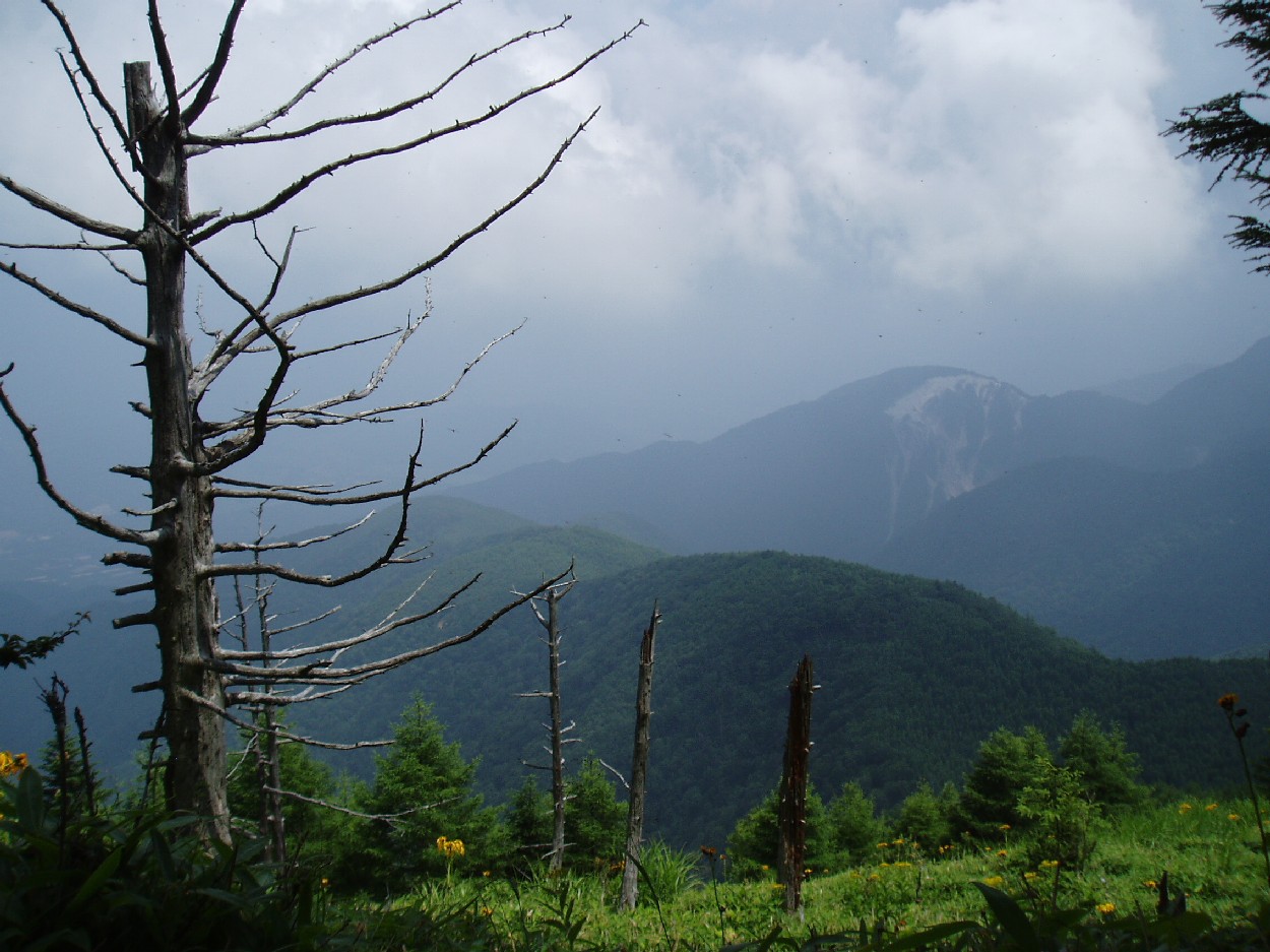写真の雨池を見下ろす三ツ岳から40分ほど下った地点に、理想的なテラスがあり涼風に吹かれながらビールとランチで至福の時を過ごした。