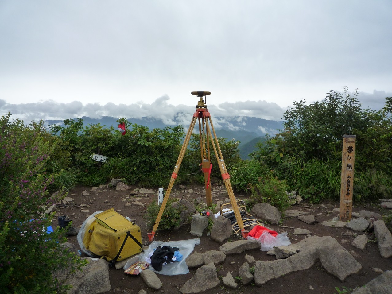 写真は、上部にGPS受信機を取り付けた三脚とケーブルで接続された左の黄色い箱が測定器で連続6時間の計測データーから誤差15mm以内の測量を行う。