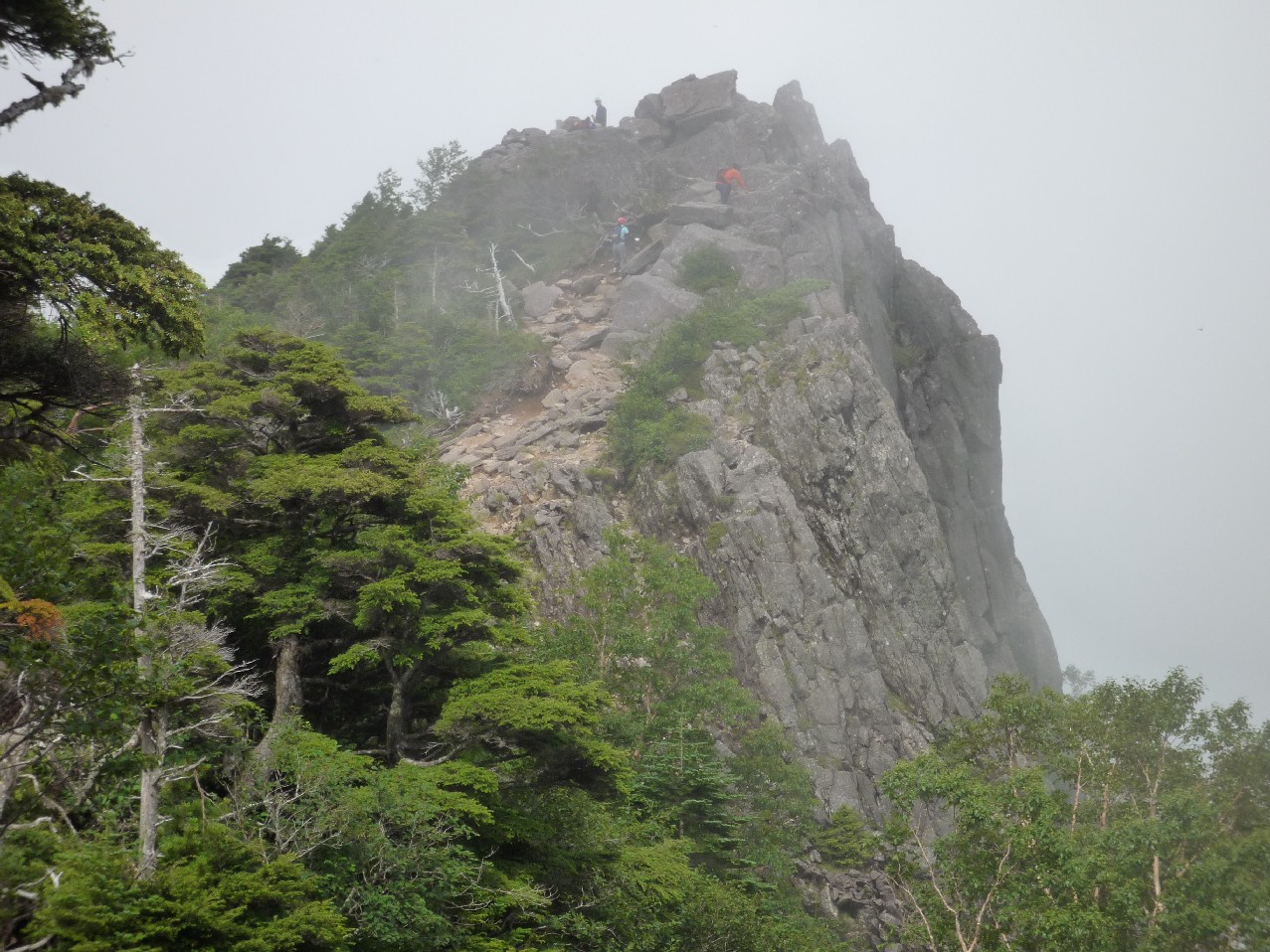 写真は、北八ツでは特異な存在となっているニュウの岩峰(2351m)で東南面の急崖が霧の中に鋭く切れ落ちている。