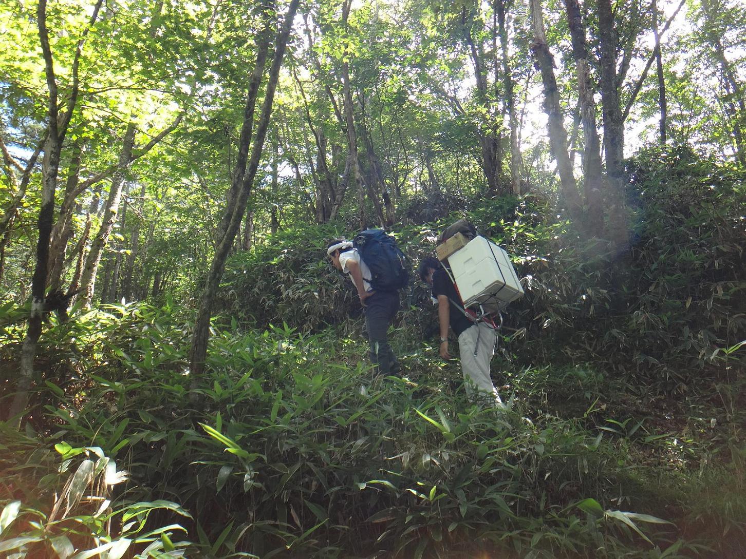 山小屋では徒歩で荷物を運搬する歩荷(ボッカ)が日常の仕事で食材から燃料などすべてが人の背中で運ばれてくる。