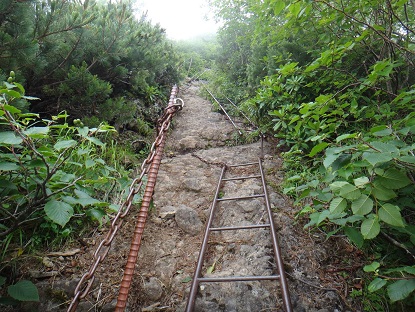 9合目手前の長いハシゴ(写真)の中段は傾斜が緩くカメラを出す余裕があるが全体的にザレ場なので落石に対する細心の注意を払う。
