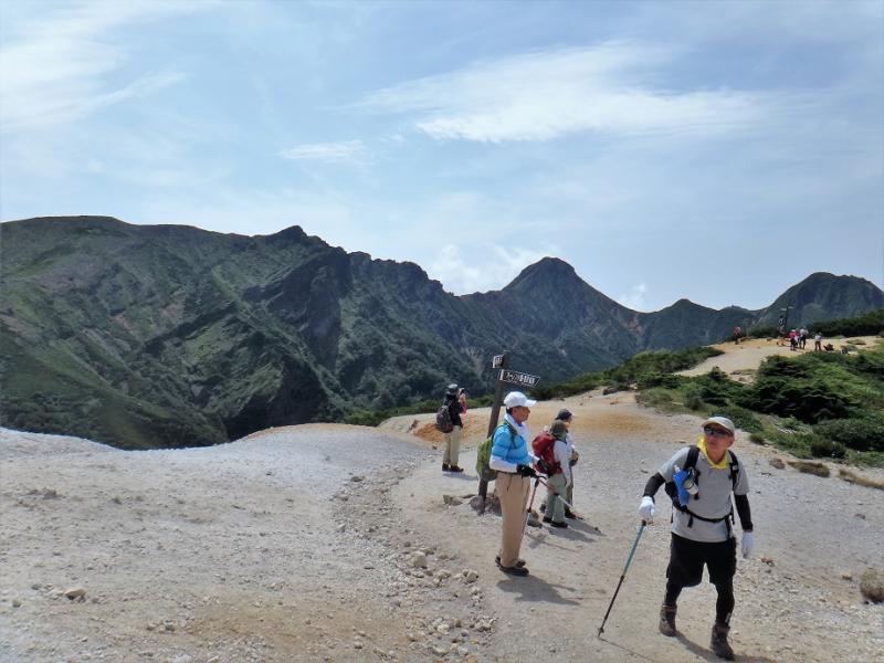 A・B組ともに6名ずつに別れ、ベテランリーダーS氏がB組を受け持ってくれ、ご長男のTさんもサポートに付いて頂いたお陰で健脚組は安心して硫黄岳に向かうことが出来た。