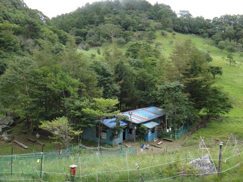 昨年は娘と二人、六本木峠を過ぎたあたりで降り出した雨が次第に本降りになり引き返した。今年も只木さんに野菜を届ける時期が来たが、連日の雷注意報とゲリラ豪雨の日々が続く。息子の休暇のタイミングと天気図をにらむとチャスンスは15日しかない。ミッション成功のカギは午前中、昨夜遅くに帰省した息子にも頑張って5時に起きてもらい大急ぎで支度を整え6時に家を出た。車窓から東の空を望むと大菩薩の稜線に掛かる積雲は薄く、時々切れて青空も見える。だが下界の天気予報が全く通用しないのが山の天気で、いくら経験して学習してもイメージと一致しない。 今日もスタートこそ日差しもあったが、僅かな時間の間に日が陰って暗くなったり、霧が立ち込め幻想的な雰囲気に変ったり、急に冷たい風が吹いたりと目まぐるしい。 施錠された小屋に着くと同時に、裂石から歩荷で登って来た只木さんと以心伝心一年振りの再開ができ感激。電気柵で囲った花畑と山小屋丸川荘の全景(写真)左手に毎年8月末の満月の夜に開催される峠の風コンサート広場が 見える。丸川峠特有の地形が天然の音楽ホールになり多くのファンが集う。柳沢峠07:40~丸川峠10:05 2+25