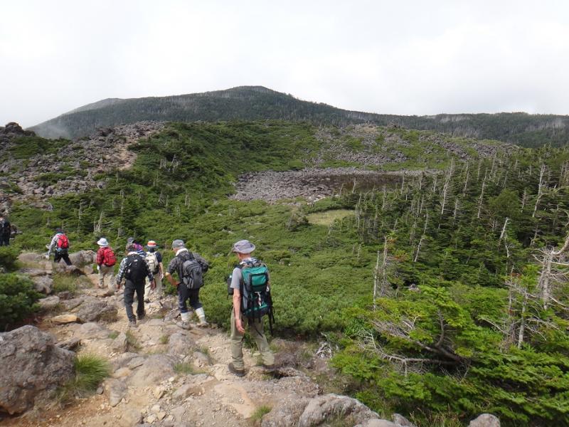 クラブで毎年8月に計画している八ヶ岳、今年はベテランリーダーS氏が北八ヶ岳の天狗岳を計画した。天気は盆明けを境に大陸の乾いた空気に入れ替わり、北海道大雪山では初雪を観測、毎日出ていた雷注意報も消えて週末の晴天が約束された。自身は毎月第三日曜日の消防訓練に参加するため欠席の予定でいたが、参加希望者が乗車定員を超える8名となり追加の車も必要になった事で、消防を休ませて頂きSLとして参加する事にした。5時集合で高速を飛ばし6時過ぎには登山口の唐沢鉱泉に着くが駐車場はすでに満車、路肩に駐車して外に出ると想像以上の寒さを感じる。準備しながらS氏から時計回りか反時計回りか問われるが、どちらでもリーダーの判断に従いますと答える。内心は前回(2011・10・2)に単独で反時計を周回しているので時計回りに期待したが、的確なS氏の判断は最後に疲れた足で緩やかに下れる反時計周りを選択した。鉱泉前の橋を渡りスタートから急勾配の登山道に入ると雨上がりの苔が美しい。黙々と高度を稼ぎ森林限界の展望台に出ると歓声が上がる。素晴らしい眺望、槍、穂高、御嶽、中央、仙丈、鋸、甲斐駒、北、もちろん八ヶ岳の連山が青空に映える。やっぱり山は天気だね。大満足のメンバー9名がスリバチ池を右に見て(写真)天狗の奥庭を黒百合平に下る。唐沢鉱泉06:30~西天狗岳10:20 3+50