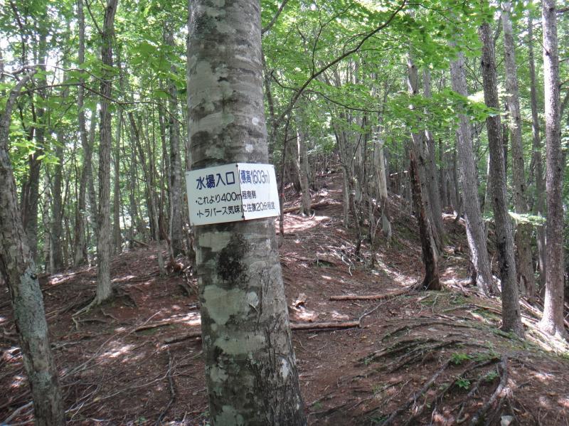 14~15日にクラブのY君とテン泊で笊ヶ岳を計画して準備をしてきたが、台風10号の速度が遅くて無理だろう。今日はY君と奈良田の湖畔でテント設営練習と、急坂の激登りを体験するため笹山の水場までピストンした。標高差773mをコースタイム3時間以内を目標に登り、水場の確認と幕営地を探す。急坂に喘ぐこと42分で山の神に着く。今にも朽ちそうな小さな社には一番搾りが供えられ、真新しい紙垂が付けられいる。地元の人が大切に護っている様子が感じられる。次のチェックポイントは1344m地点の尾根が直角に曲る場所で、下山時に枝尾根に迷い込む恐れがある。86分、倒木とロープで厳重にガードされた尾根の合流点に着く。確かに地形的には真っ直ぐに下ってしまう所だ。本線はやや鋭角気味に右折(下り)になる。ここでデジタルウォッチの高度計を補正する。あと260mのアルバイトだ。有り難い事にここから傾斜が緩くなり、アセビのトンネルが続く頃は一息つける。やがてブナの木に水場入口を示すプレート(写真)が現れ、本日の激登りが終わった。水場へは南にトラバース気味に緩やかに下る。踏み跡は途中から薄くなるが、ペンキを拾いながら約10分で小さな沢音が聞こえて来た。このコースで唯一の貴重な水場は、水量は少ない(300cc/30s)が冷たくて美味い南アルプスの天然水が湧いていた。近くに幕営適地も見つかり、ゆっくり昼食とコーヒーを淹れて過ごした。奈良田湖09:00~笹山水場11:40 2+40