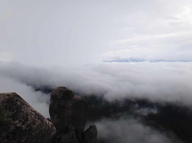 連続した9号10号が去っても台風一過の晴れは無かった。それどころか低気圧と前線による不安定な状態が続き、局地的な雷雨が毎日ある。Y君とテン泊でトライする笊ヶ岳が一週間後に迫りトレーニングの仕上げに瑞牆山に登った。本当は両神山を計画していたが、午後から雨の確立が高く近場で済ませることになった。登りは久しぶりにカンマンボロンを行く。濡れた下草に靴やズボンの汚れも御構いなしにグングン高度を稼ぐ。クラブ山行でも、Y君とも何度も登っているルートだから道に不安はないが、一箇所だけシャクナゲ群生地の手前に昨年の台風19号によると思われる大きな倒木があり迂回に難儀する。路面も濡れていて滑りやすいから下山は別コースだなと考え始める。やがて富士見平コースを往来する登山者の声が聞こえて来ると大ヤスリ岩は近い。こんな天気でも瑞牆山の人気は凄い。霧で景色は見えなくても山頂を極めた登山者は誰も晴れやかな顔をしている。30人以上で賑わう山頂を離れ、西のピークに移動してラーメンを食す。休んでいると風が冷たく、しばらく出番なくリュックの底で眠っていたヤッケを出して着る。眺望はあきらめ帰ろうとした時、一瞬だけ霧が流れ(写真)大ヤスリ岩の彼方、低層の積雲と高層雲の間に南アルプスを捉えた。直後に雨粒が落ち始め傘を差して不動滝コースをゆっくり下山した。自然公園07:05~瑞牆山09:40 2+35(カンマンボロン)