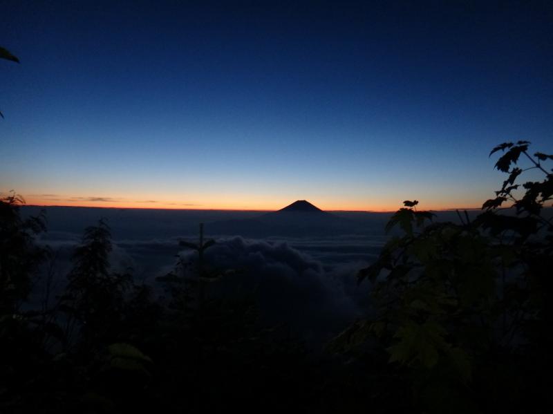 2:00アラームで目覚めたY君に起こされ長い一日が始まる。標高2021mにしては寒さを感じない。テントの結露もない。風もなく静かだ。テントを出て星空を探すが周囲には霧が立ち込め月も見えない。経験的に不安がよぎる。2:50サブザックで出発、少しだけ下って直ぐに昨日とおなじ厳しい急登になる。不安が的中する。辺りはモミ、ツガの原生林が鬱蒼と茂り、昼間でも慎重なルートファインディングが求められる区間だ。霧の中をヘッドランプが照射する限られた範囲の中に赤テープを探しながら、時に木の根を掴みながら這い上がる。急勾配の上に倒木も多く、跨いだり潜ったり、背中の荷物が軽いことが唯一の救いだ。4:10小ピークを過ぎて霧の層を抜けた。満天の星空が広がり、振り返れば南アルプス深南部の彼方に街の灯りも見える。晴天が確証された瞬間だ。やがて左手が地図の危険マークが記す大きなガレ場になり、暗闇の中に吸い込まれないように縁を慎重に歩く。この直後、4:45余りに唐突に布引山の山頂に到着する。静岡県が立てる山頂標柱は立派で、三角点標石の直ぐ脇に建つ。テント場には3張り、その内1張りは中に灯りがある。東の空が白み始めて来たから先を急ごう。5:30コル着、真東に雲海から上がる御来光を拝む。ラスト1ピッチ25分の登り返しでハイマツをかき分けて山頂に、念願の笊ヶ岳に立った。小笊と富士山と太陽が一直線に並び(写真)我々を迎えてくれた。桧横手02:50~笊ヶ岳06:10 3+20