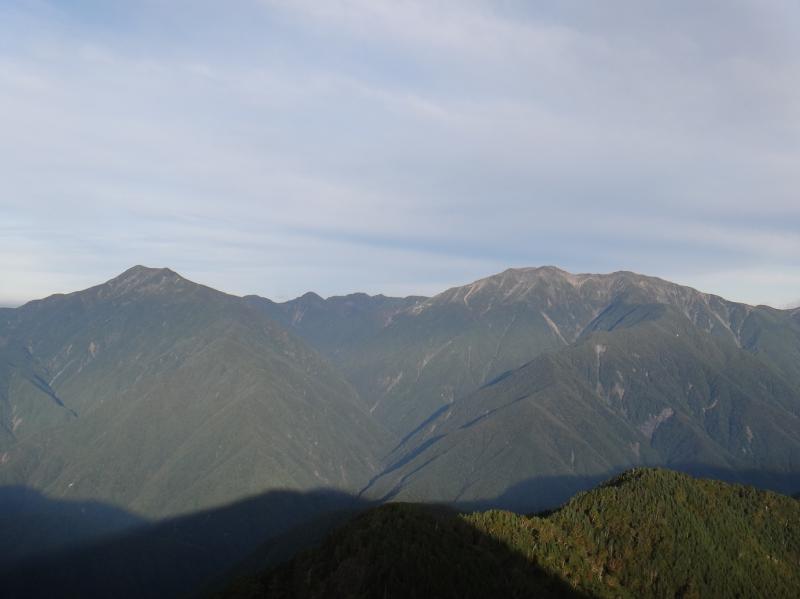 ハイマツが迫る山頂は狭く、布引山と同じ静岡県の立派な標柱が三角点の近くに、その脇に山梨県の標柱が控えめに並ぶ。背後には南アルプス南部の名峰群が指呼の間に広がり(写真)眼下には影笊も、北に目をやれば遠く鳳凰三山まで見える大展望だ。ほどなくして単独の男性(同世代)が登って来る。昨日、桧横手で我々を追い越し、布引山で灯りがあったテントの主だ。神奈川から来て深夜の老平で車中泊、やっと念願の笊に登れたと屈託無く話す。写真を撮り合い、下りのタイムが読めないから、お先にと15分ほどで下っていった。屈強にして謙虚な親しみやすい山男だった。他にも昨日、広河原で越された男性二人組、桧横手で下ってきた単独日帰りの男性二人、合わせて五人と出会ったが何れもスペシャリストだ。それに比べ半端な自分達が恥ずかしい。さて我々も帰ろう。日が暮れる前に下山できなければ2泊目を山中で過すことになる。7:55布引山まで下りて来ると3張りあったテントは跡形もない。神奈川の男性は相当なベテランだから速やかに撤収したと思われるが、残りの2張りは出会うことなく消えた。小笊の帰りにショートカットしたと推測する。この大きな山に二人だけ取り残された。今日も最後尾になる。激下りを桧横手のテントに戻る。休む間もなく撤収だ。時間との競争だから朝食はあきらめ行動食で我慢する。「山では年齢は言い訳にならない」 自分に言い聞かせ頑張る。長い下りの末に無事下山!共に頑張ったY君に感謝!!笊ヶ岳06:40~桧横手09:35 2+55