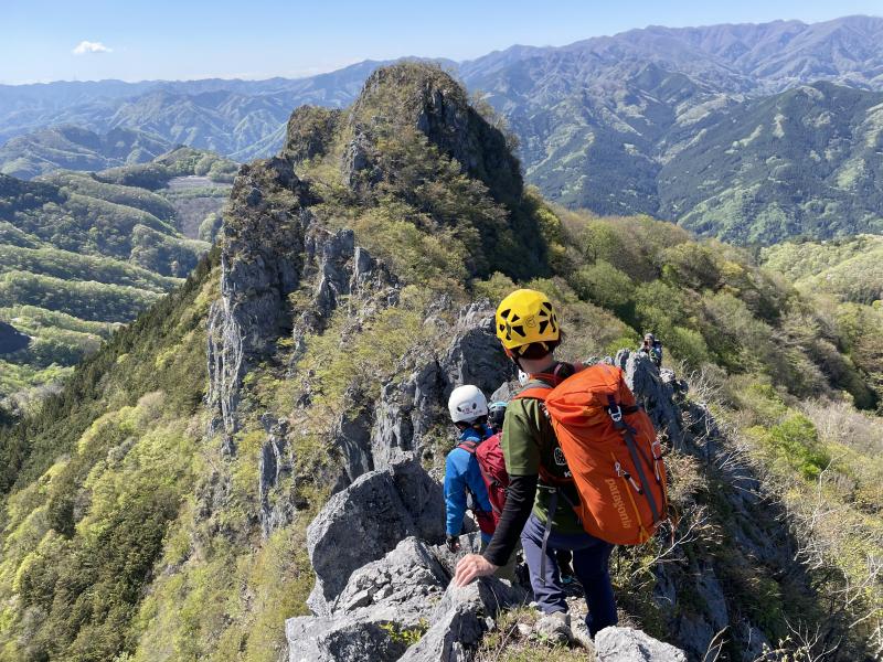 夏に北鎌尾根を目指すメンバー対象の岩トレーニングが二子山で開催され総勢13名が参加した。前日の雨で水量を増した沢を詰めて65分で股峠に着く。ちょうど開山祭の最中で神主の祝詞を聞きながらハーネスを着ける。先ずは東岳をピストンしてウォーミングアップする。股峠に戻り昼食を摂り、西岳に向けて上級者コースへ左折する。程なく岩壁の基部に到着した。若手のY君とA君がリードし支点を構築する。石灰岩の壁はホールドが豊富で、グレードはⅡ~Ⅲ級程度と易しい。2ピッチでブッシュ帯に入るとロープは必要ない。登攀はあっけなく終わった。稜線に上がると快晴の青空が広がり、両神山をはじめ西上州の名だたる名峰が見渡せる。14時過ぎ登山開始から5時間で西岳の山頂に立った。やれやれも束の間、この後の岩稜通過(写真)が核心部だった。両側が切れ落ち踏み外したら一巻の終わり。幸い無風で良かったが、この頃に甲府では10m以上の強風だったようだ。TX