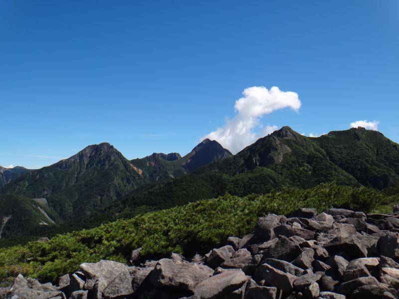 長かった梅雨が明けたら一気に真夏に突入して、甲府は連続10日の猛暑日が続き午後3時頃の発雷が日常になった。昨日は北岳の稜線で21歳の男子大学生が雷の直撃で亡くなる痛ましい事故が発生してしまった。自身も同じ20代前半の盆休み、友人と白峰三山縦走を計画し稜線を歩いたが、間ノ岳に到着した時点で周囲に湧き立つ積乱雲に恐怖を感じ農鳥を断念、北岳山荘に逃げ帰った思い出がある。幸い落雷は遠くで済んだが、夜はテントごと吹き飛ばされそうな強風が吹き荒れた。夏の高山では一日の中にすべての気象現象が起こるのが普通で、一番の脅威として雷が発生する。さて今日は午前中に時間が出来たので、涼しい森でトレーニングと思い編笠山(2524m)に登ることにした。登山口の観音平(1580m)から標高差944mを2時間で登り午前中に下山する計画。いつものようにスタートから飛ばす作戦だが、涼しいはずの森の中は無風で暑く早めに給水をとる。雲海展望台39分は休まず通過する。先行者を次々に追い越して頑張ると標高の上昇と共に暑さは和らぐが、アブがうるさい。押手川81分は大幅に遅いが2分だけ休む。ラスト1ピッチがこのコース一番の急坂になるが、森林限界近く、遠く北アルプスまで展望が開けて気分は良い。目標を12分も超過しても、天然クーラーが快適な山頂からは南八ヶ岳の主峰群(写真)を一望に大満足。飛び交う赤トンボには立秋を感じた。
