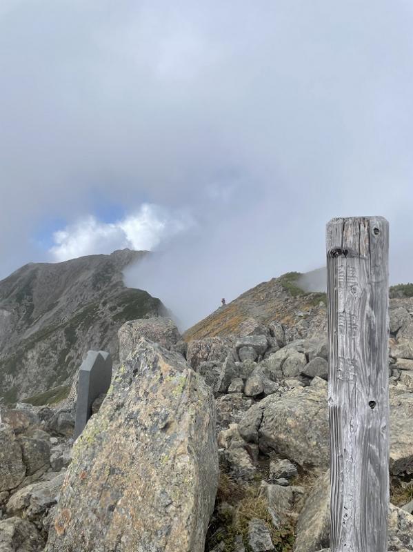 秋の白根三山縦走を目標にトレーニングに励んできた。それがコロナによる市営山小屋の休業が30日まで延長され計画の変更を余儀なくされる。考える時間は十分にあったのに、山梨百名山の最後に残った農鳥岳に拘った結果、奈良田から大門沢を農鳥岳への標高差2196mを日帰りと、半ば無謀なプランを決行してしまった。ただ、土曜日に最接近した台風14号(温帯低気圧)の影響は考慮した。沢の増水が心配で大門沢小屋に電話すると、若い小屋番は感じ良く親切にアドバイをくれた。降雨は少なく水量も1~2割増し程度だから本流は大丈夫です。問題は小屋の上部と下部に各2ケ所ある支流の横断で、普段は飛び石で渡れるが渡渉になる事があります。この情報通り最初の小古森沢で先行する男女グループが難儀している。激しい流れと濡れた岩を前に誰でも怖いが、飛び石は躊躇なくリズムで渡るといい。それにしても沢沿いで涼しいはずが、台風の置き土産か蒸し暑く、Tシャツ1枚でも汗が吹き出す。地図から読む標高も1200mに満たないから仕方がない。暑さより気を病んだのがルートの地形で、尾根を高巻いたり河原に下りたり複雑な変化を繰り返す。昼中は随所にある赤テープが進路を示してくれるが、帰り途中で日没ならヘッドランプで下るのは御免だ。大門沢小屋8:40やっと半道中か、まだまだ先は長い急登が続く。やがて本流の源頭部まで上がった頃、ガスが湧き視界がなくなる。台風一過の乾いた青空を期待して来たが裏切られた感じだ。代わりにナナカマドの赤い実に高山の秋を感じる。12:20下降点の鐘を鳴らして先を急ぐ。13:05農鳥岳(3026m)に立つと一瞬だけ雲が切れて西農鳥が見えた。山梨百名山100本目の標柱(写真)は厳しい自然に朽ち掛けながらも凛として建っていた。